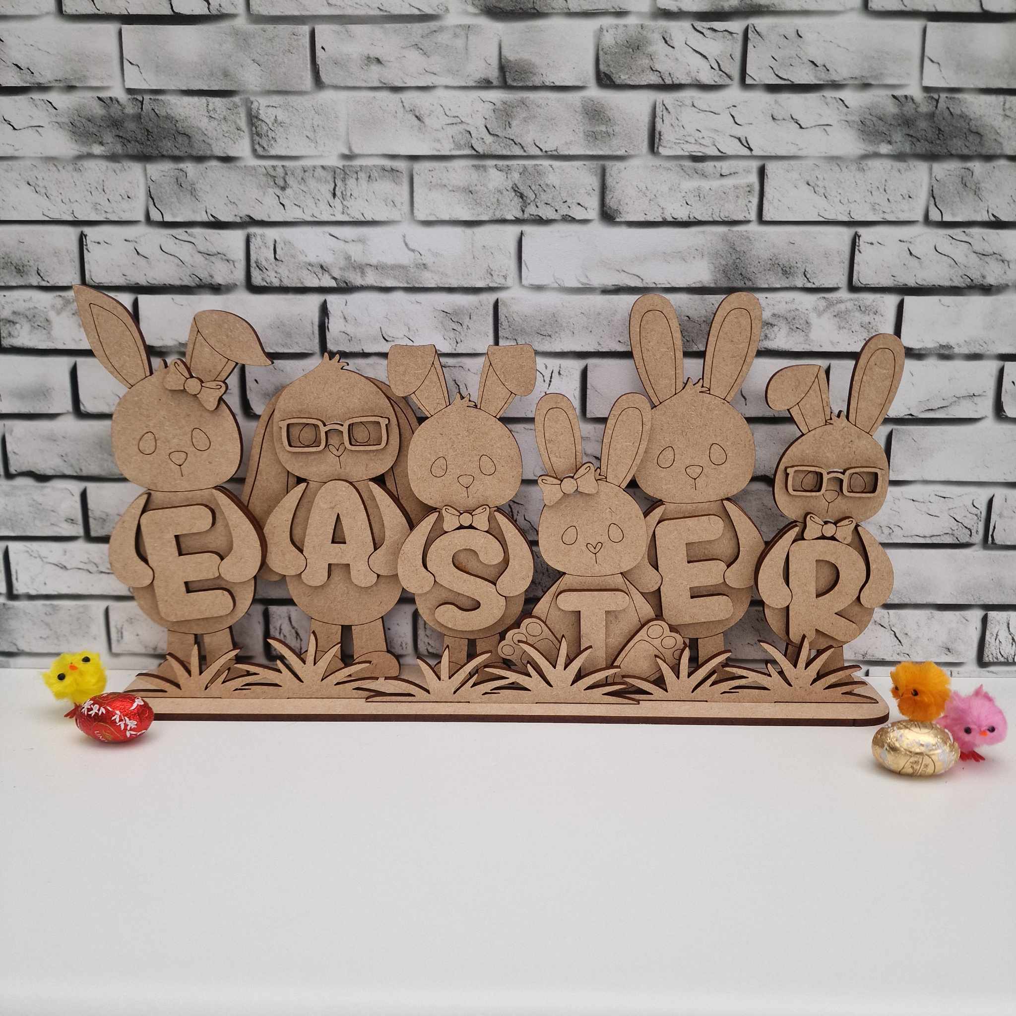 30cm wide base with holes for each bunny to sit into. Each bunny is seperate and sits in its own slot. Not painted or glued and the pieces are seperate for ease of painting.