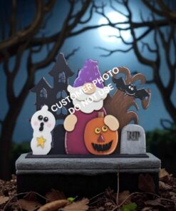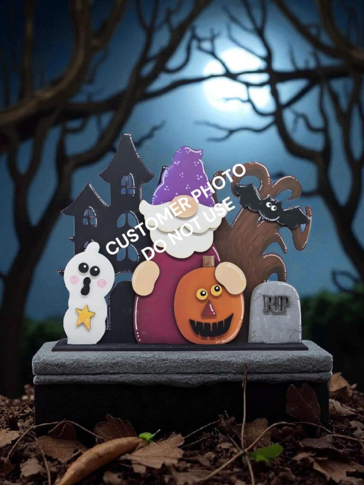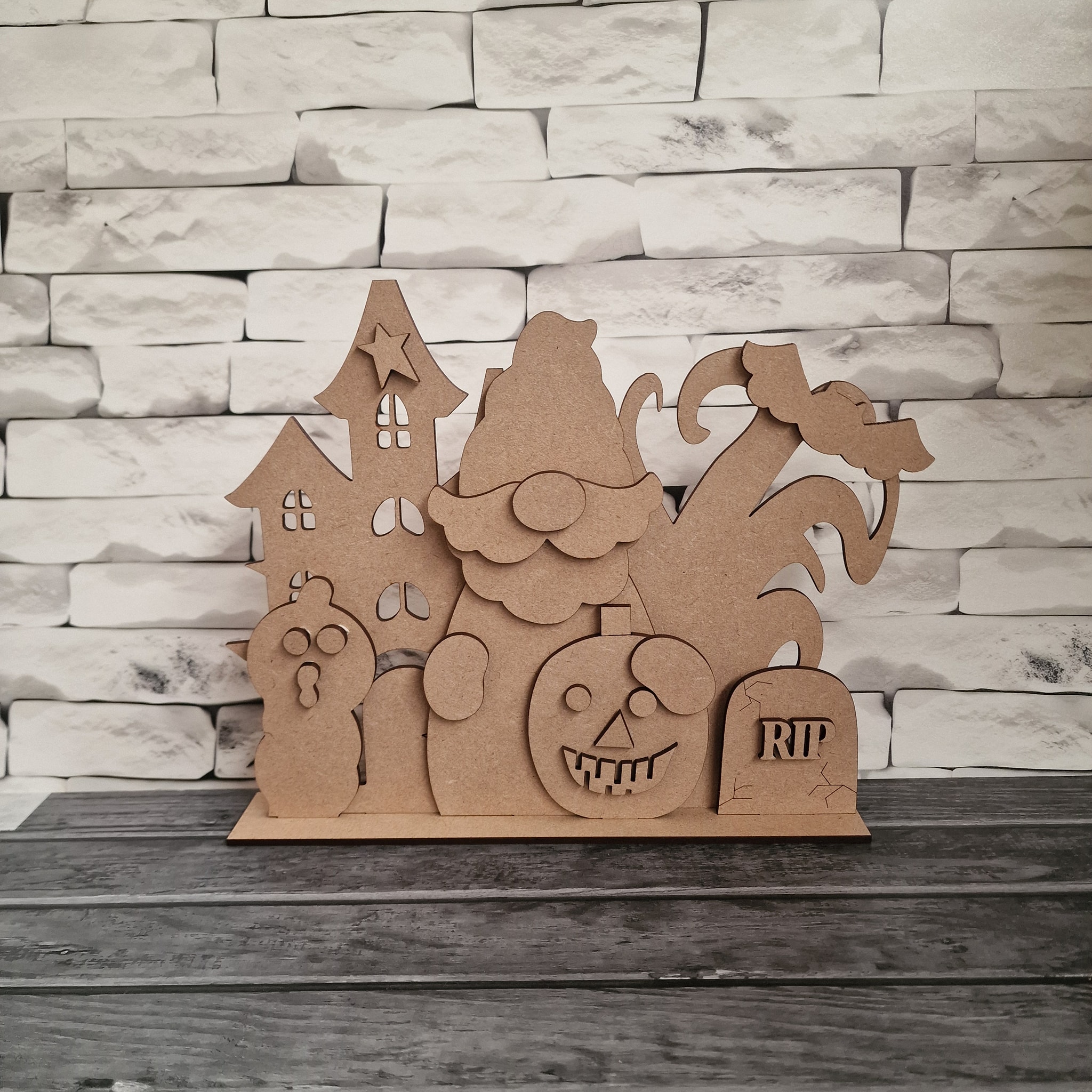 Haunted house with gnome on base is cut from 3mm MDF. 22cm tall and is in peices for ease of painting.