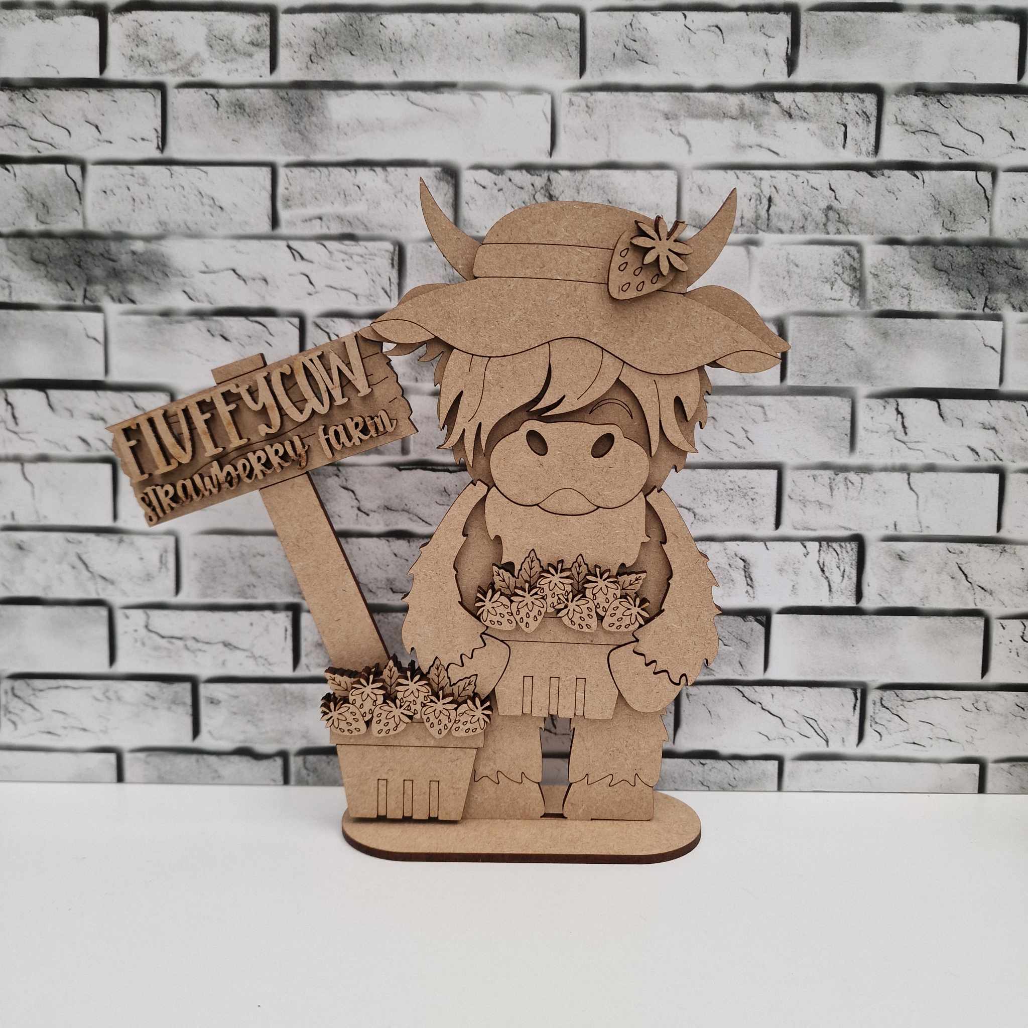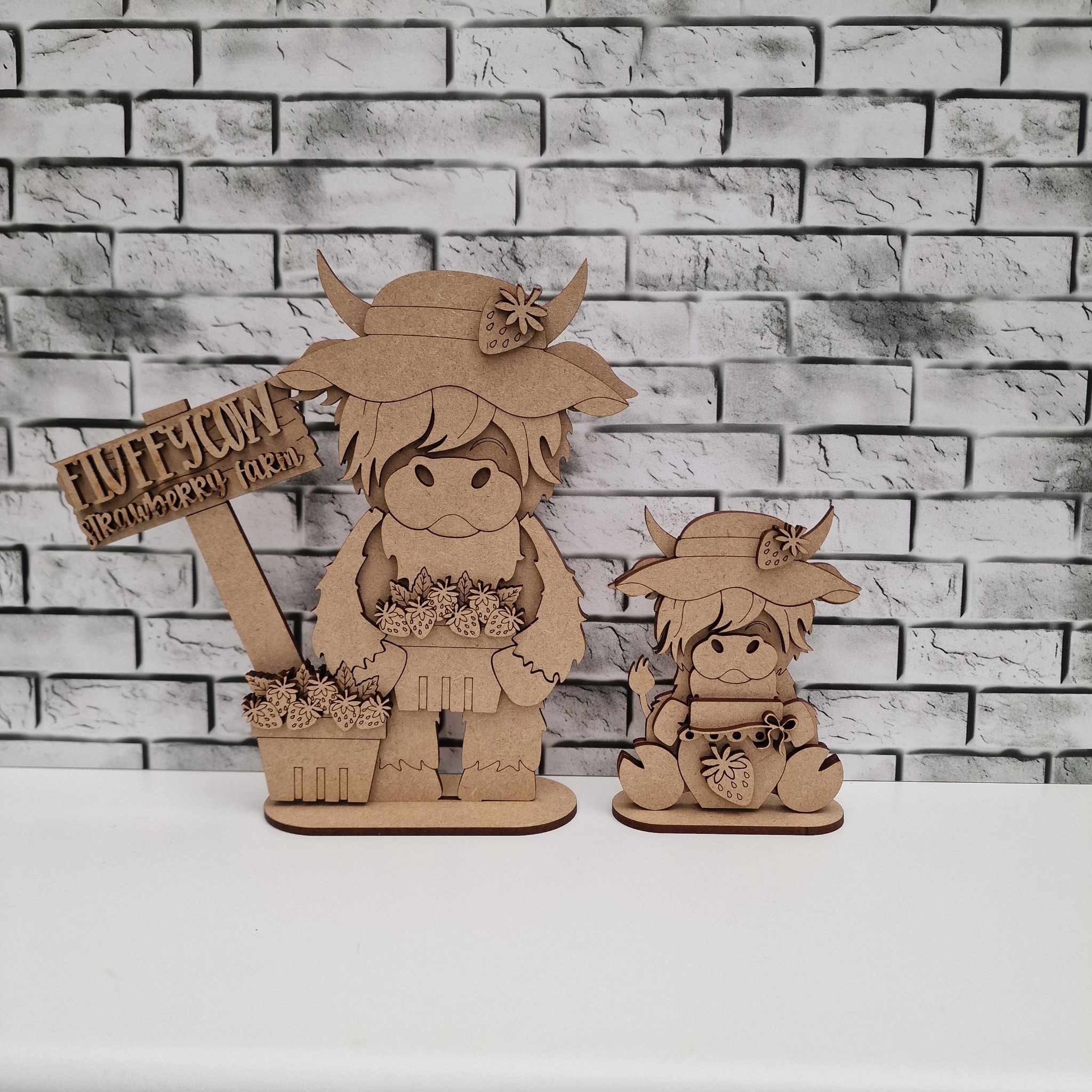 Highland strawberry in 2 sizes cut from 3mm MDF. These two designs are adorable and look great together, but are sold seprately so you can just buy the one you prefer. The standing highland is 20cm tall whilst the sitting one is just over 11cm and is super cute being small. The standing version comes with the sign, though it is all seperate for ease of painting so you could leave that off if you didn’t want to use it.