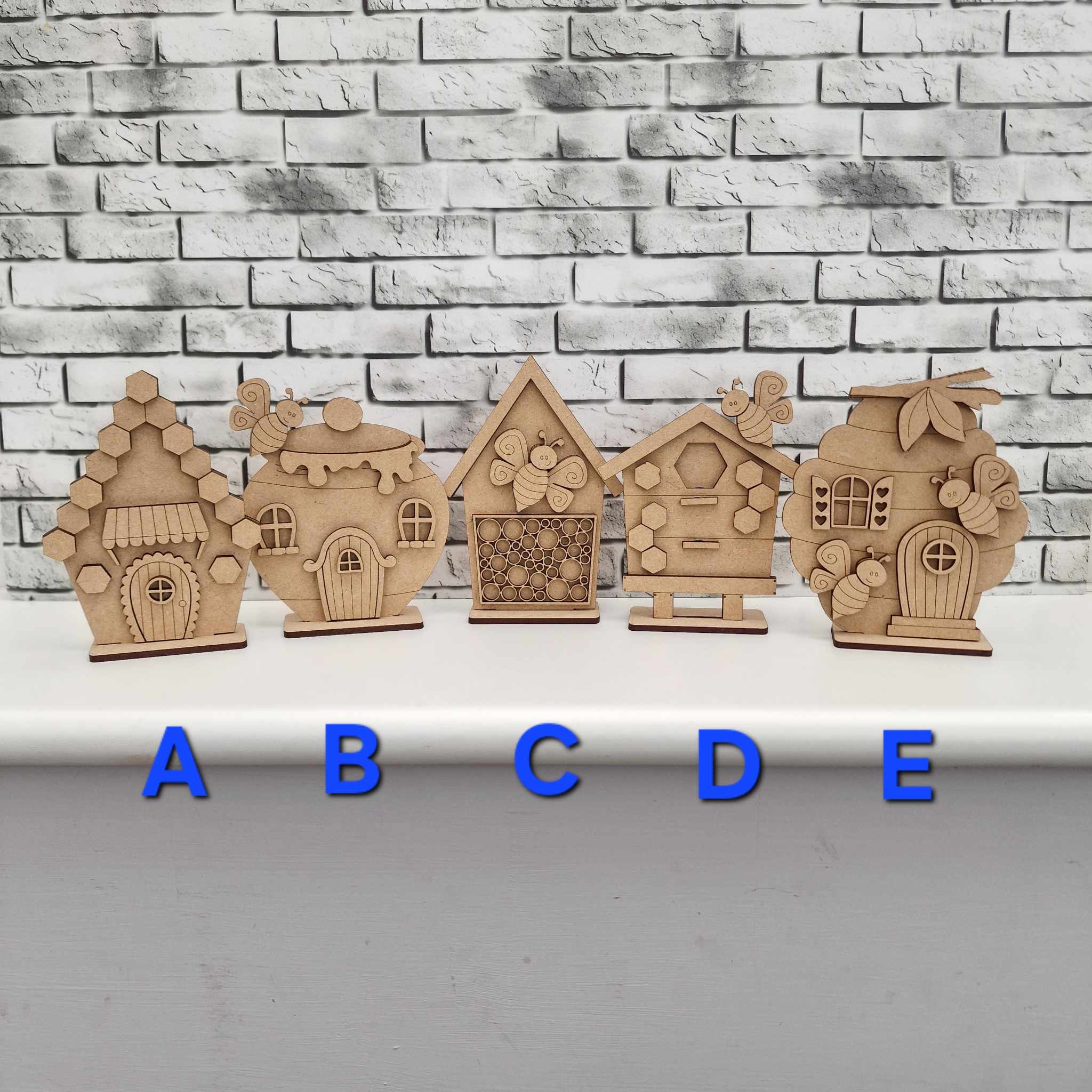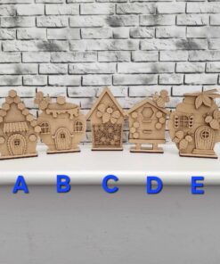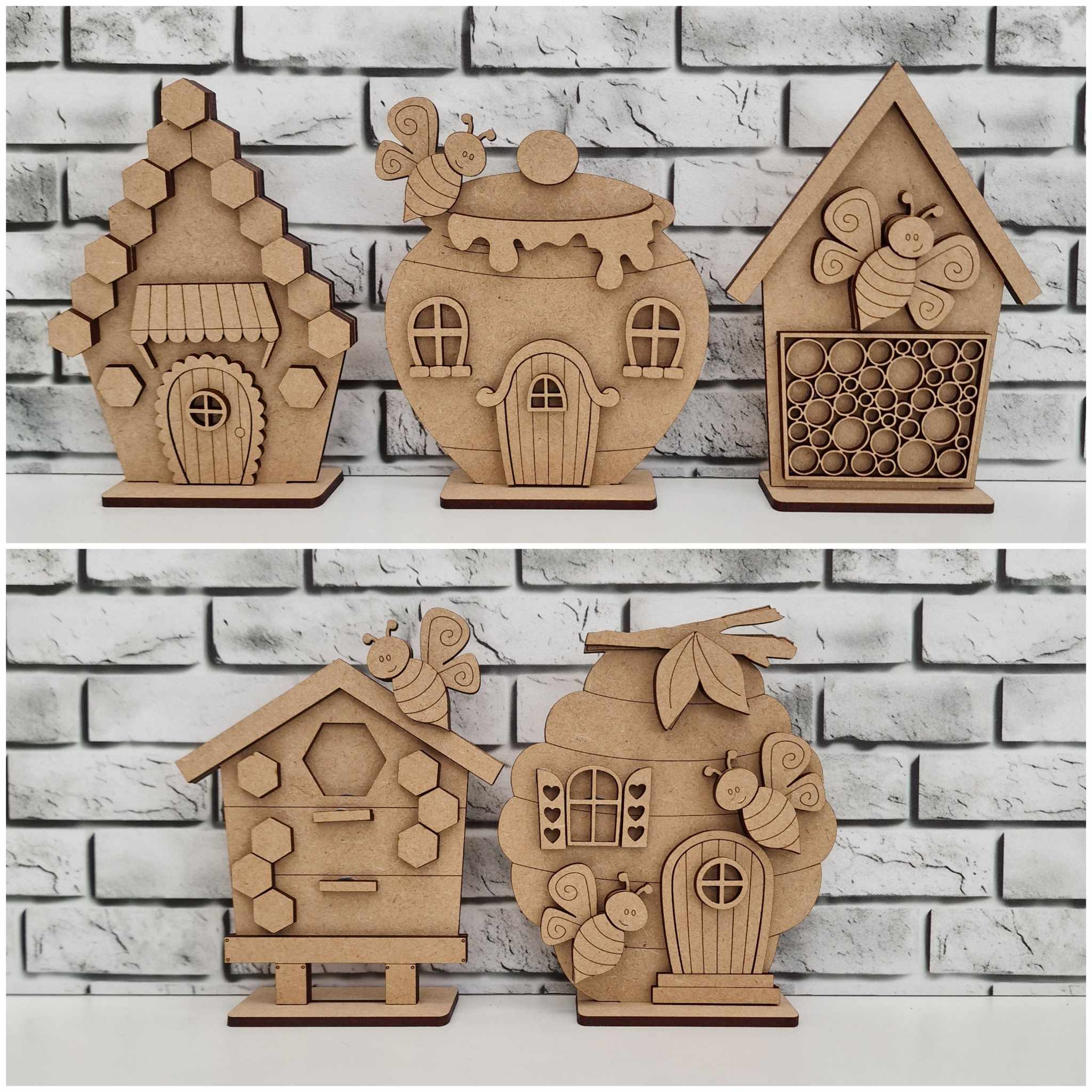 Mini houses – Bee theme as a set of 5. Each one unique and ready for painting. You can opt for a tripe or a 5house base, or just buy them all as singles.