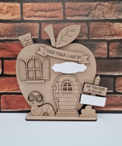 17cm apple on a base cut from 3mm MDF. White acrylic stick on parts as shown so you can use a wipeboard pen to change the details year after year. A stick on personalised name is available.